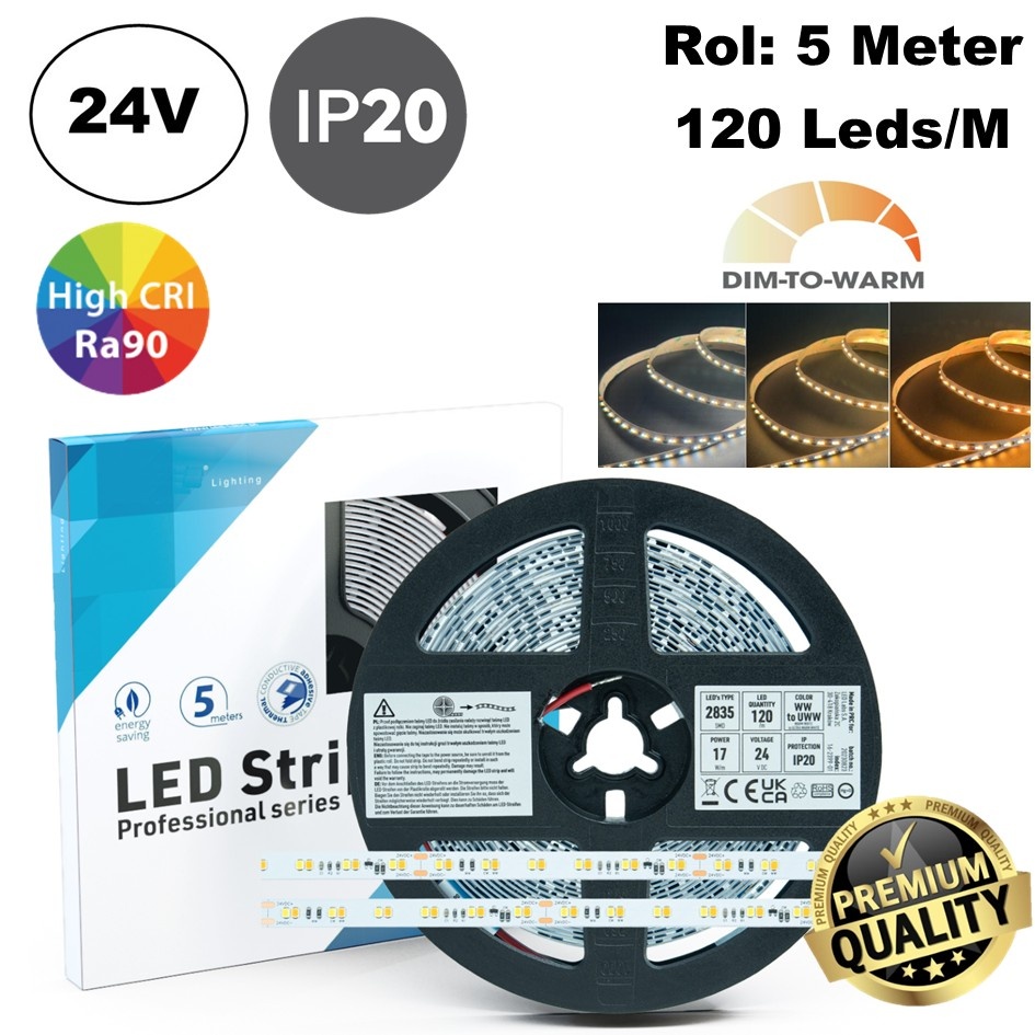 Deze zeer unieke Led strip met Dim To Warm Lichtkleur heeft maar liefst 120 Leds op een meter. De krachtige Leds zijn dicht op elkaar gemonteerd waardoor je 120 leds op een meter hebt.