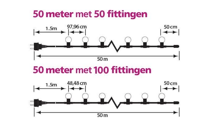 U kunt hierboven bij ‘Kies de gewenste aantal fittingen’ het aantal fittingen kiezen dat u wilt voor de prikkabel 50 meter. U kunt kiezen tussen 50 en 100 fittingen. Bij een prikkabel van 50 meter met 50 fittingen heeft u 1 fittingen per meter, bij een prikkabel van 50 meter met 100 fittingen.