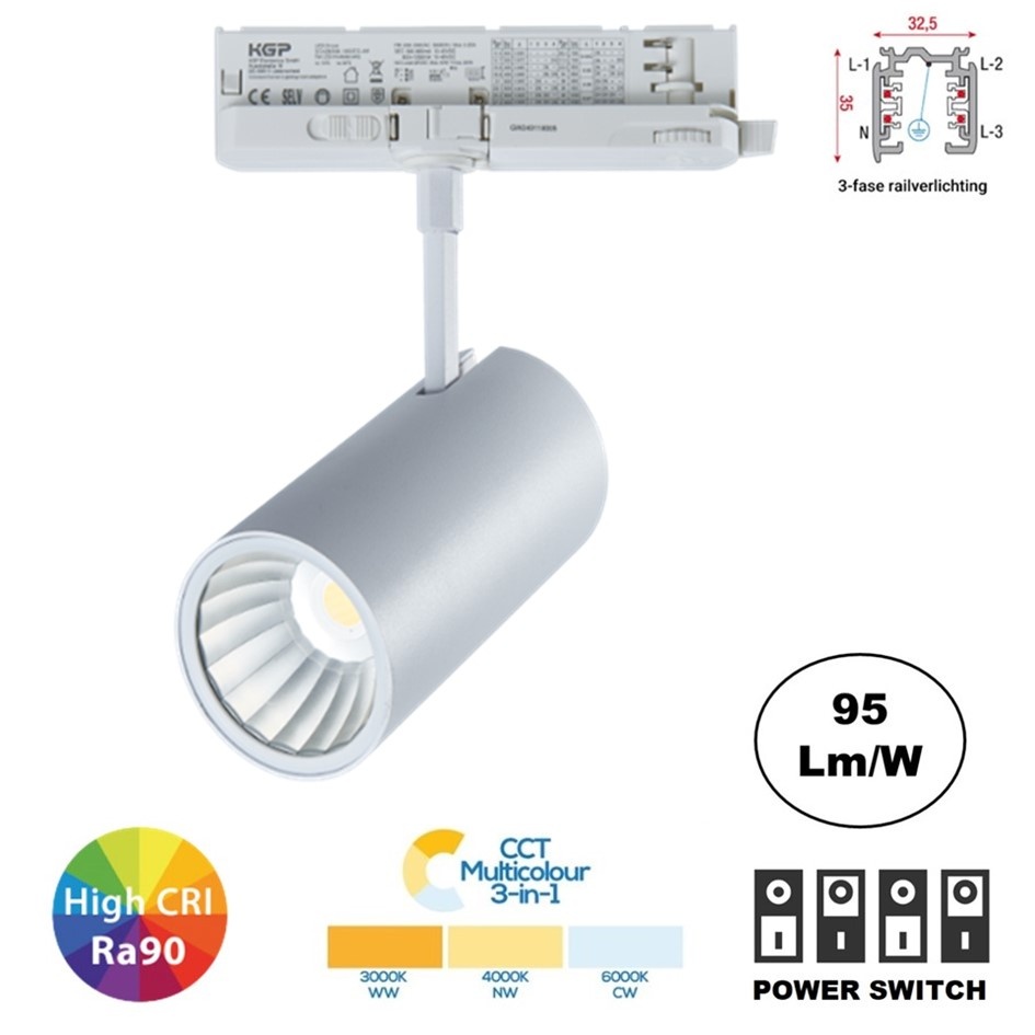 PRIME 3 Fase LED Rail Spot Koker met Wattage switch: 14-29W, CCT-Switch, 1240 tot 3195 lumen, CRI>90, Witte Behuizing , 5 Jaar Garantie