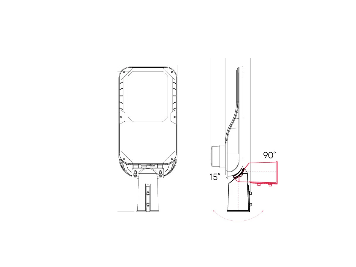 De Voet van de LED Straatlamp 150w kan +/- 15 graden gekanteld worden of in een hoek van 90 graden gemonteerd worden. Hierdoor is de straatlamp zeer geschikt voormontage aan de gevel of op een paal.