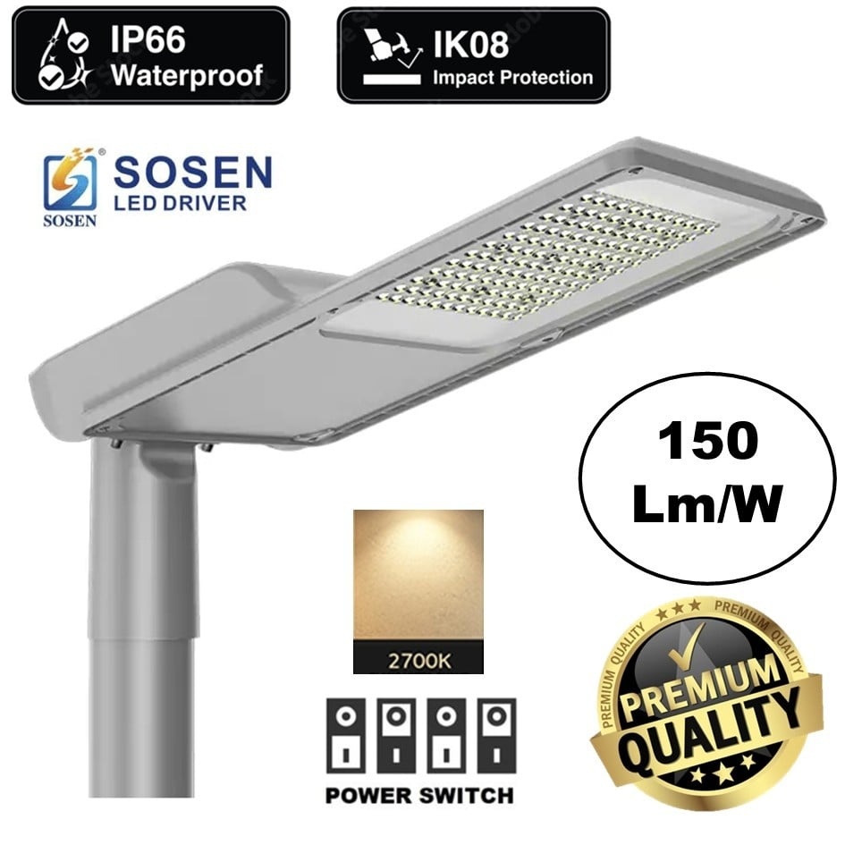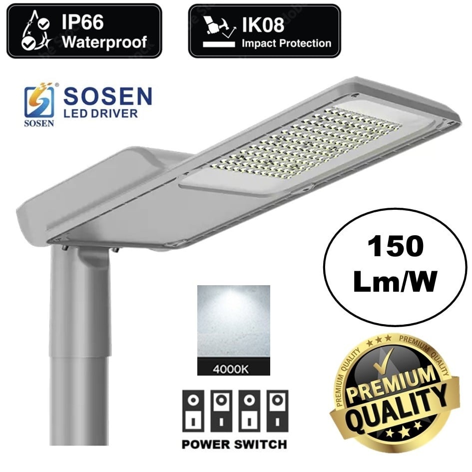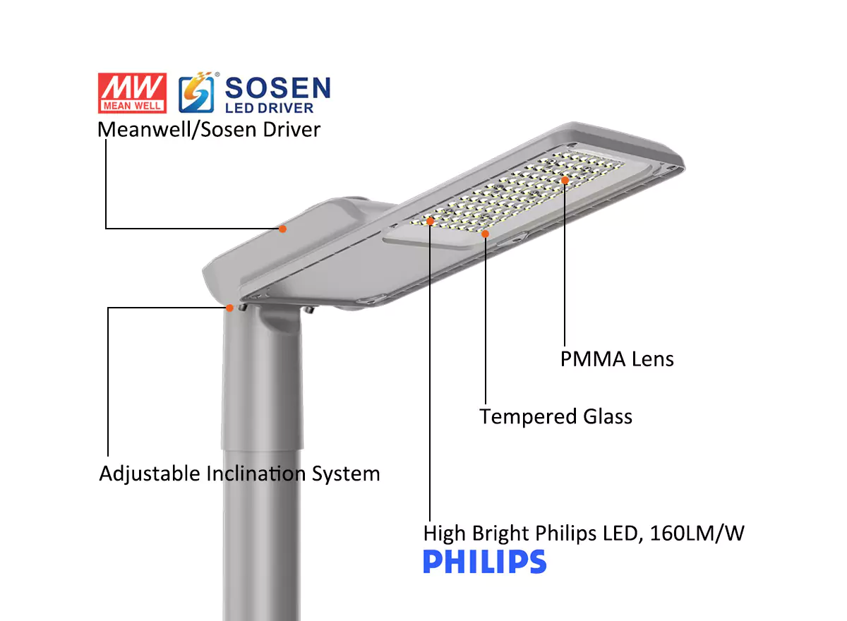 De LED straatlamp is gemaakt van Die-Cast gegoten aluminium en gehard glas, heeft een IP66 beschermingsfactor en IK08 Slagvastheid die de armatuur bestand maakt tegen alle soorten weersinvloeden. De aluminium behuizing heeft een chemisch en mechanisch anti-corrosieve behandeling gehad en is bestand tegen UV-stralen waardoor de duurzaamheid verder verbetert.