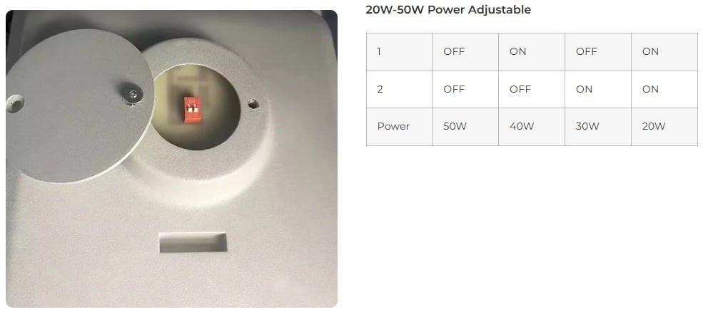 De LED straatlamp is voorzien van Dip-Switch voor het veranderen van de wattage. Zo is het mogelijk om de wattage aan te passen naar 20w / 30w / 40w / 50w (standaard ingesteld). Hierdoor kan je de lichtopbrengst aanpassen naar 3000 / 4500 / 6000 / 7500 Lumen (Lichtopbrengst in 2700K ligt 12% lager)