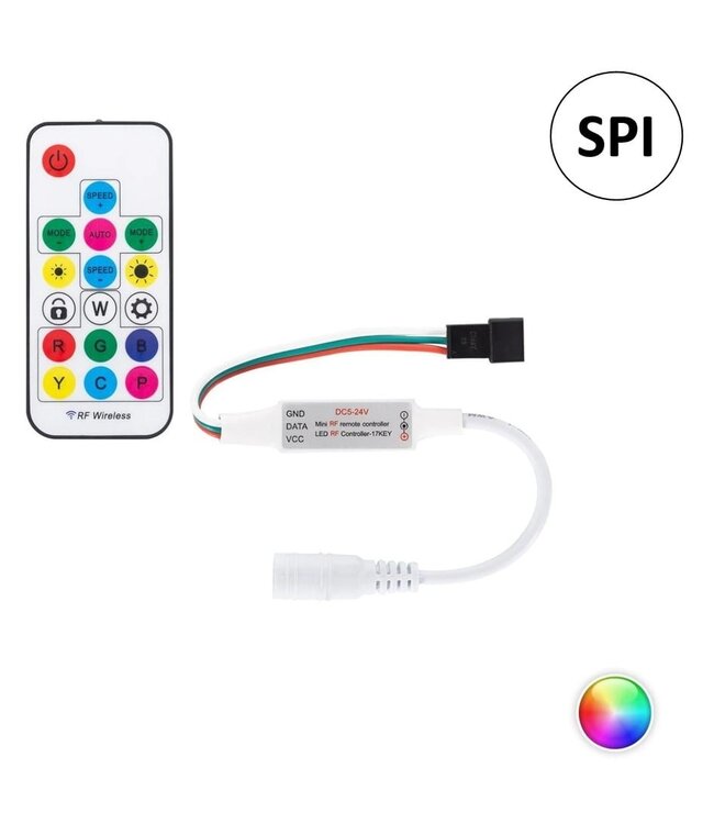 Met deze RGB Digital SPI 5-24V DC Mini LED Strip Controller met RF afstandsbediening kunt u schakelen tussen de verschillende programma's, de intensiteitsverdeling en de snelheid van het door de LED uitgestraalde licht regelen. Het maakt het ook mogelijk om het RGB-kleurbereik van de LED te programmeren met behulp van digitale technologie.