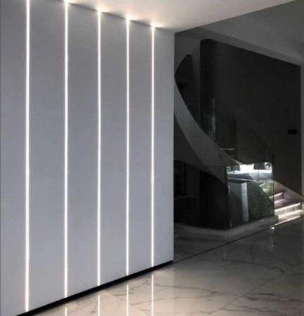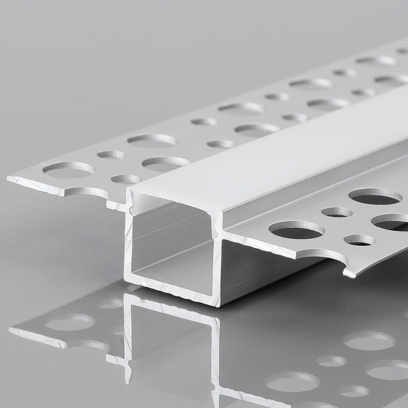 De Stuc LED strip profiel kan als inbouw profiel gebruikt worden. Waarbij je het profiel verwerkt in je gipsplaat en afwerkt met een stuclaag rondom het profiel. Je krijgt dan een strakke lichtlijn horizontale of verticale lichtlijn op je muur of plafond.